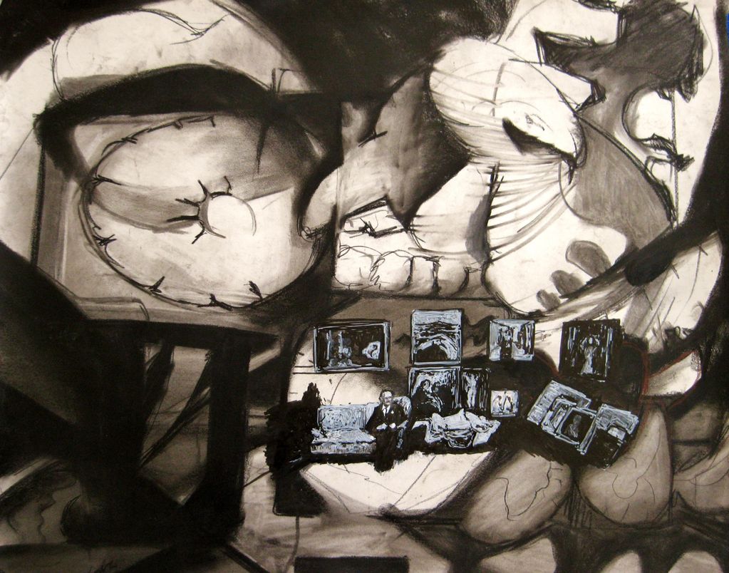 The smaller inner image is based on a photograph of Munch seated surrounded by his paintings.